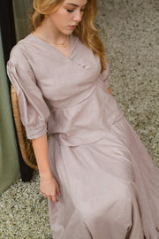 A wrap-style top with three-quarter sleeves, designed for a flattering fit.