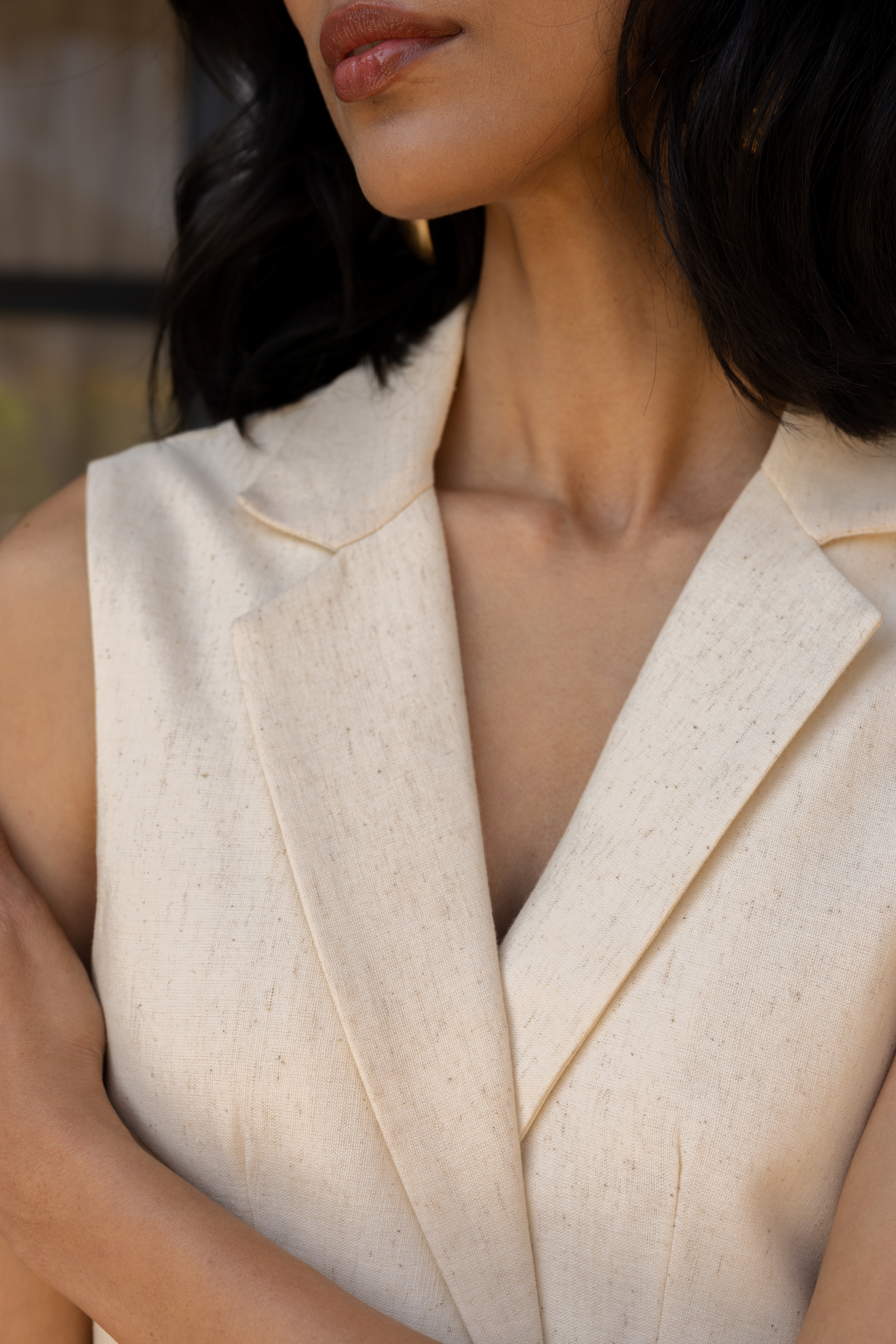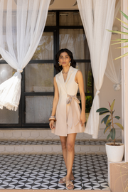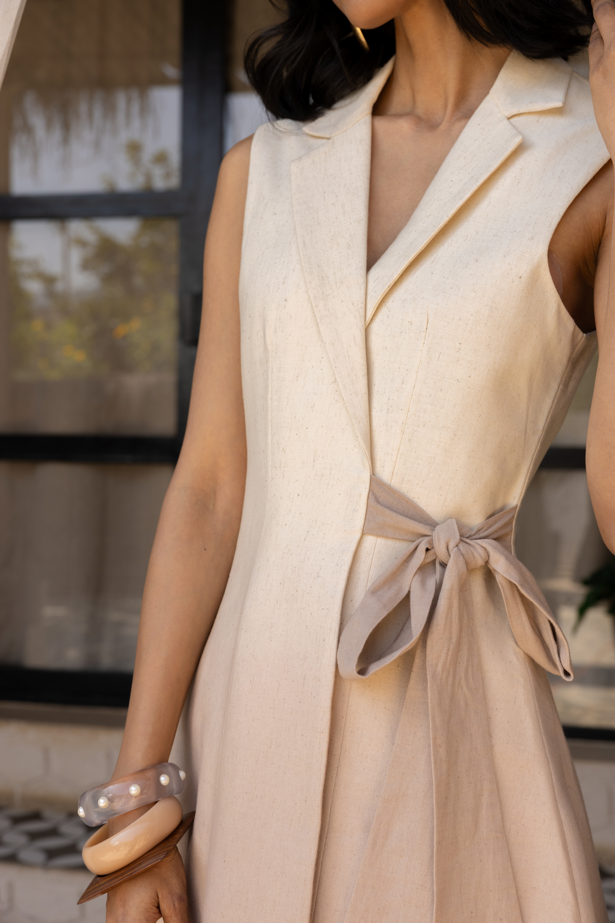 Constructed in cotton khadi with a sleeveless blazer-style neckline and a waist tie detail.