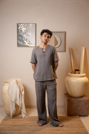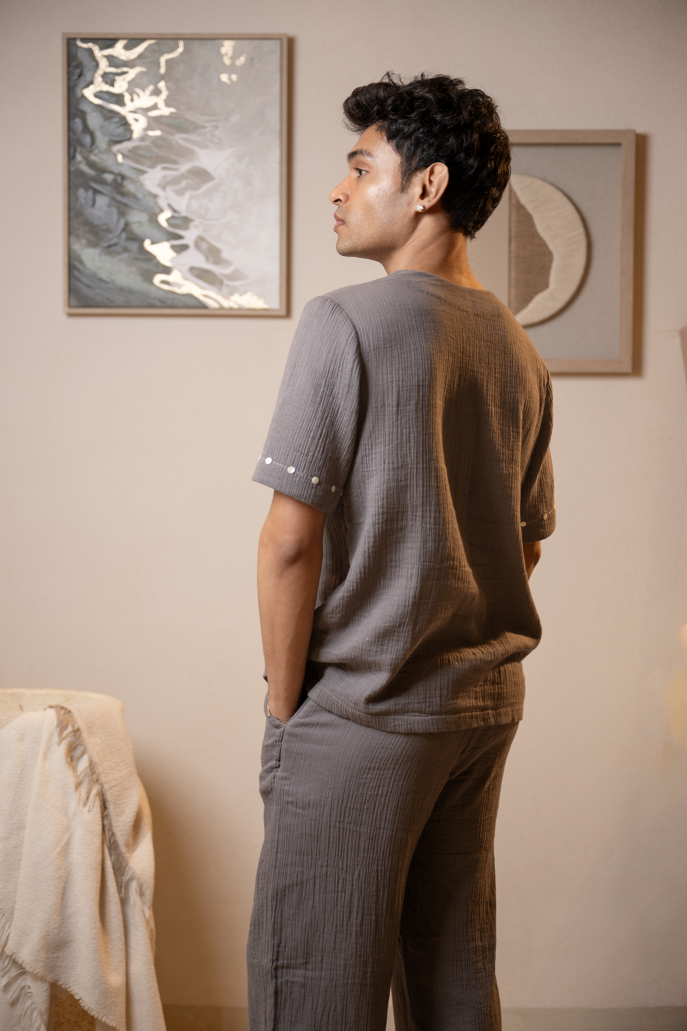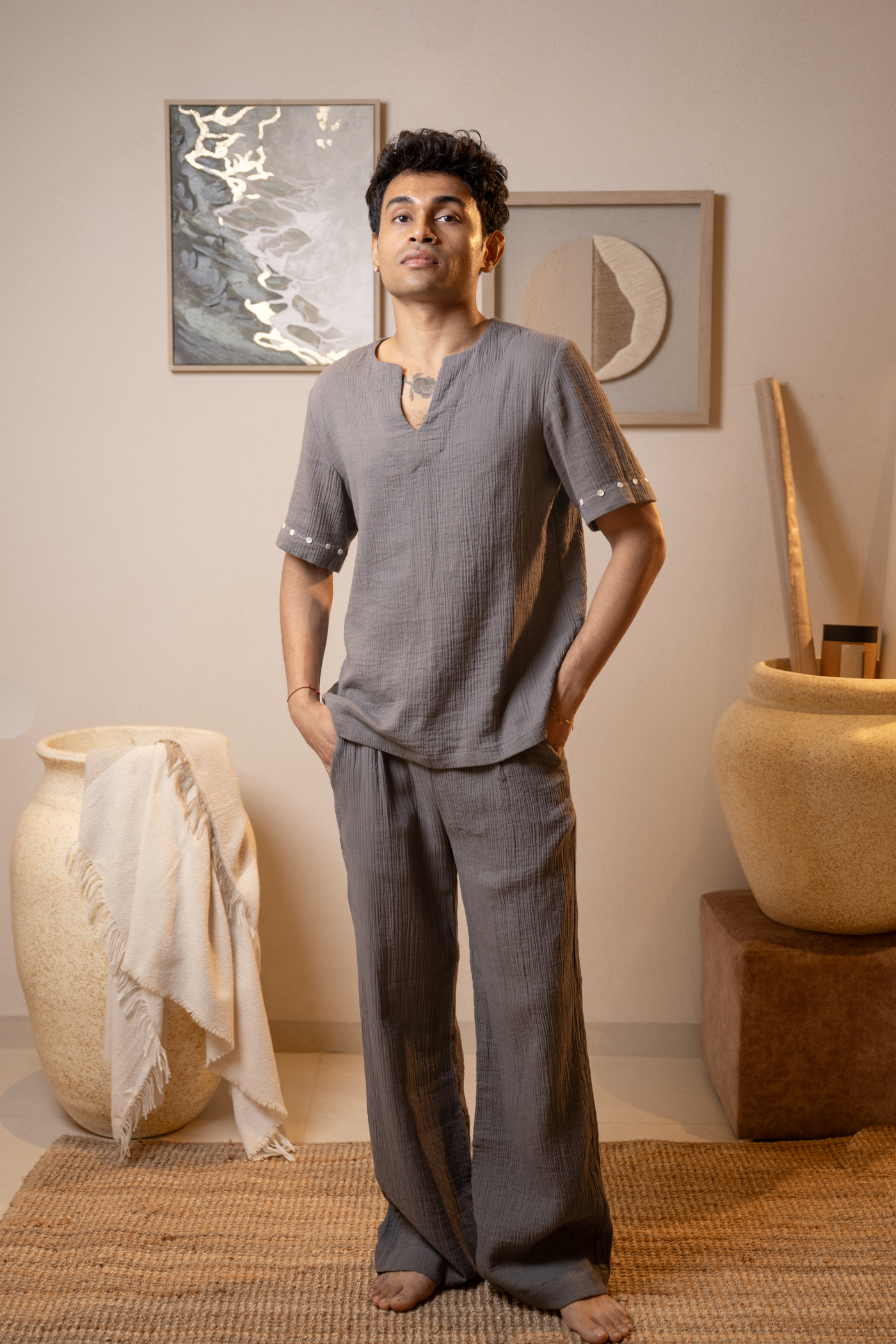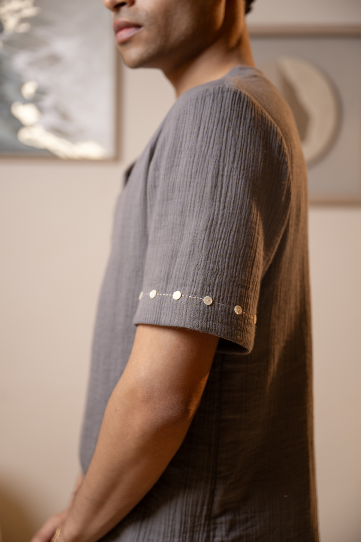 Constructed in crushed cotton with a relaxed silhouette and a soft split neckline, finished with minimal embellishment at the sleeve hem.