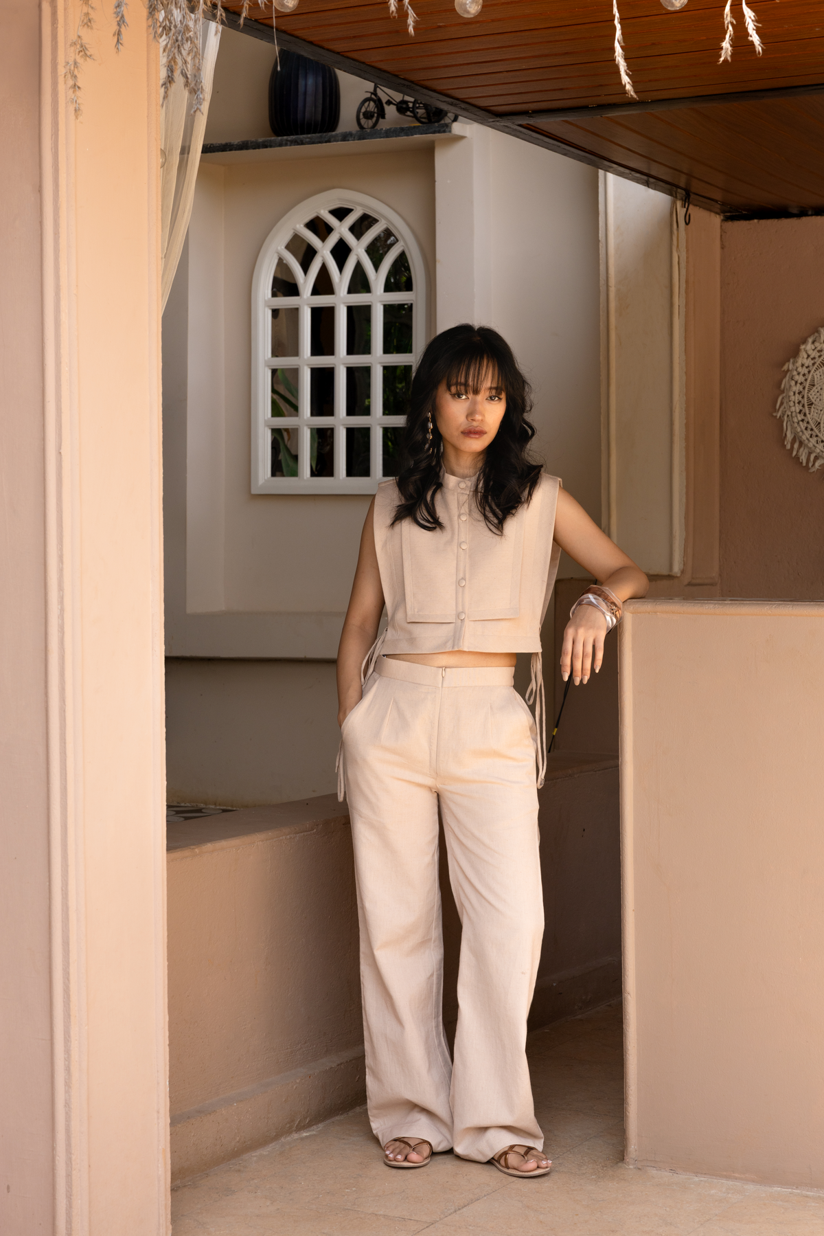• Constructed in cotton khadi with a high-waisted silhouette and front pleat detailing.