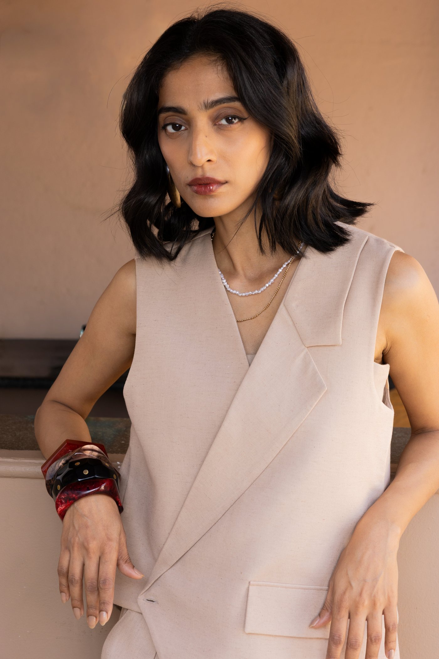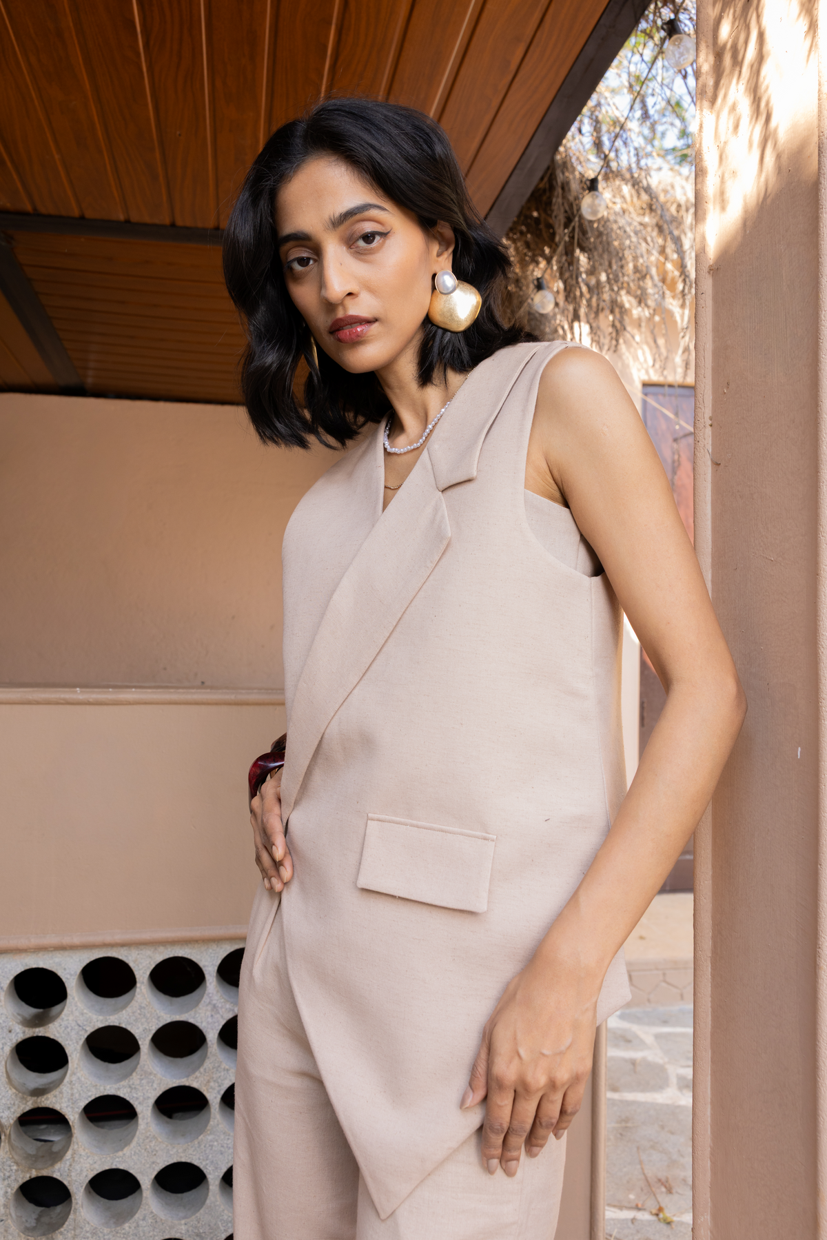 Paired with cotton khadi trousers featuring a high-waisted silhouette and front pleat detailing.