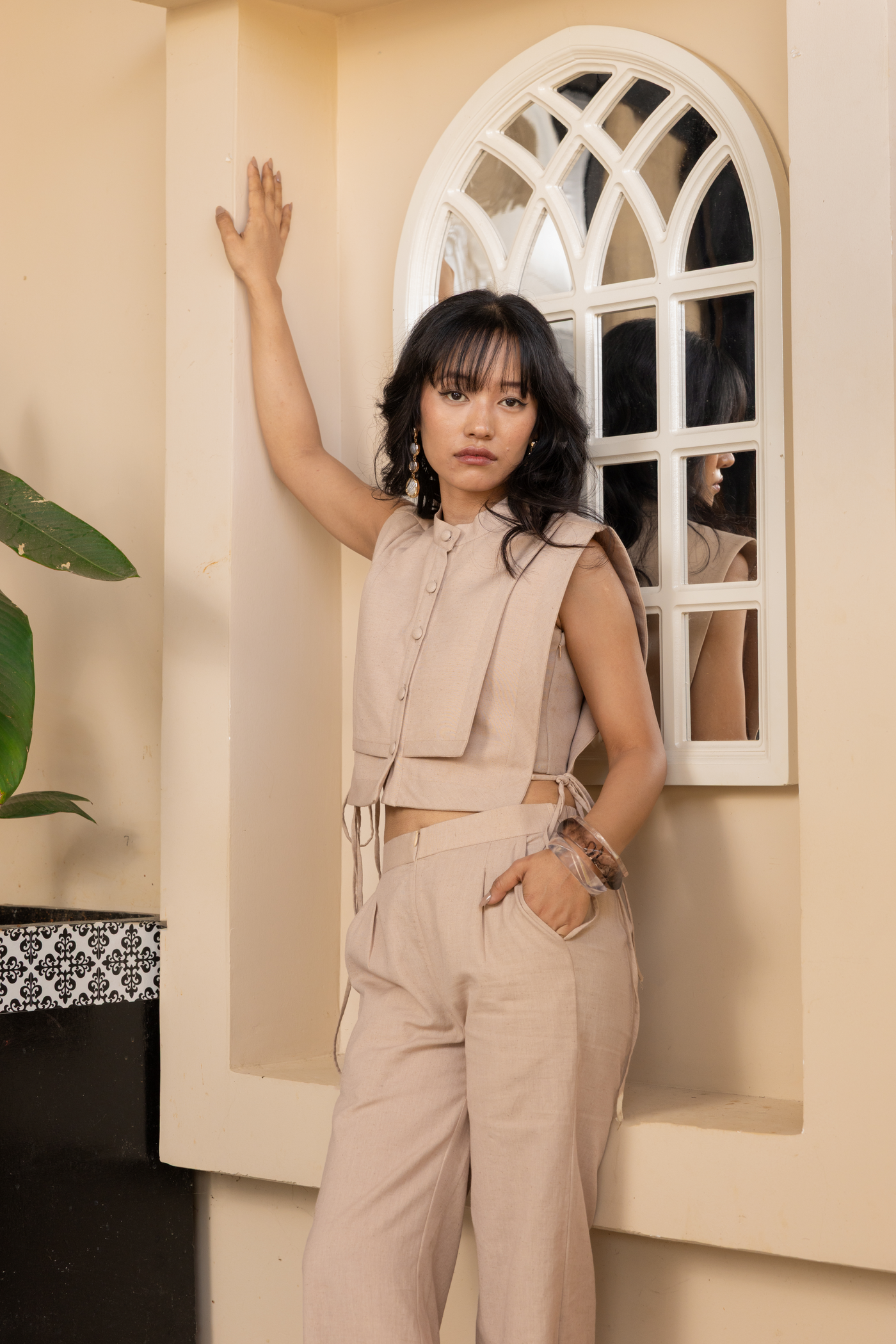 • Layered with a cotton khadi crop top featuring slim shoulder straps and a clean, cropped silhouette.