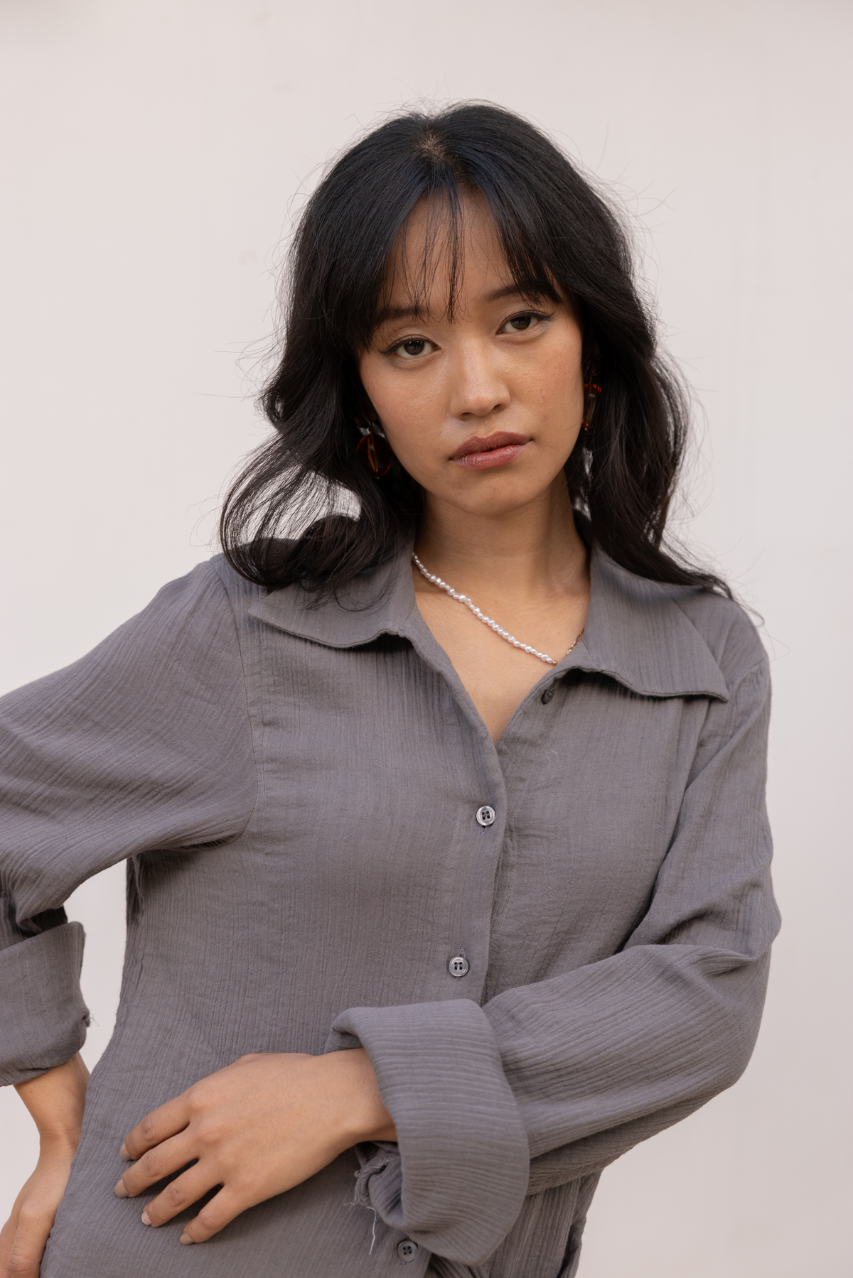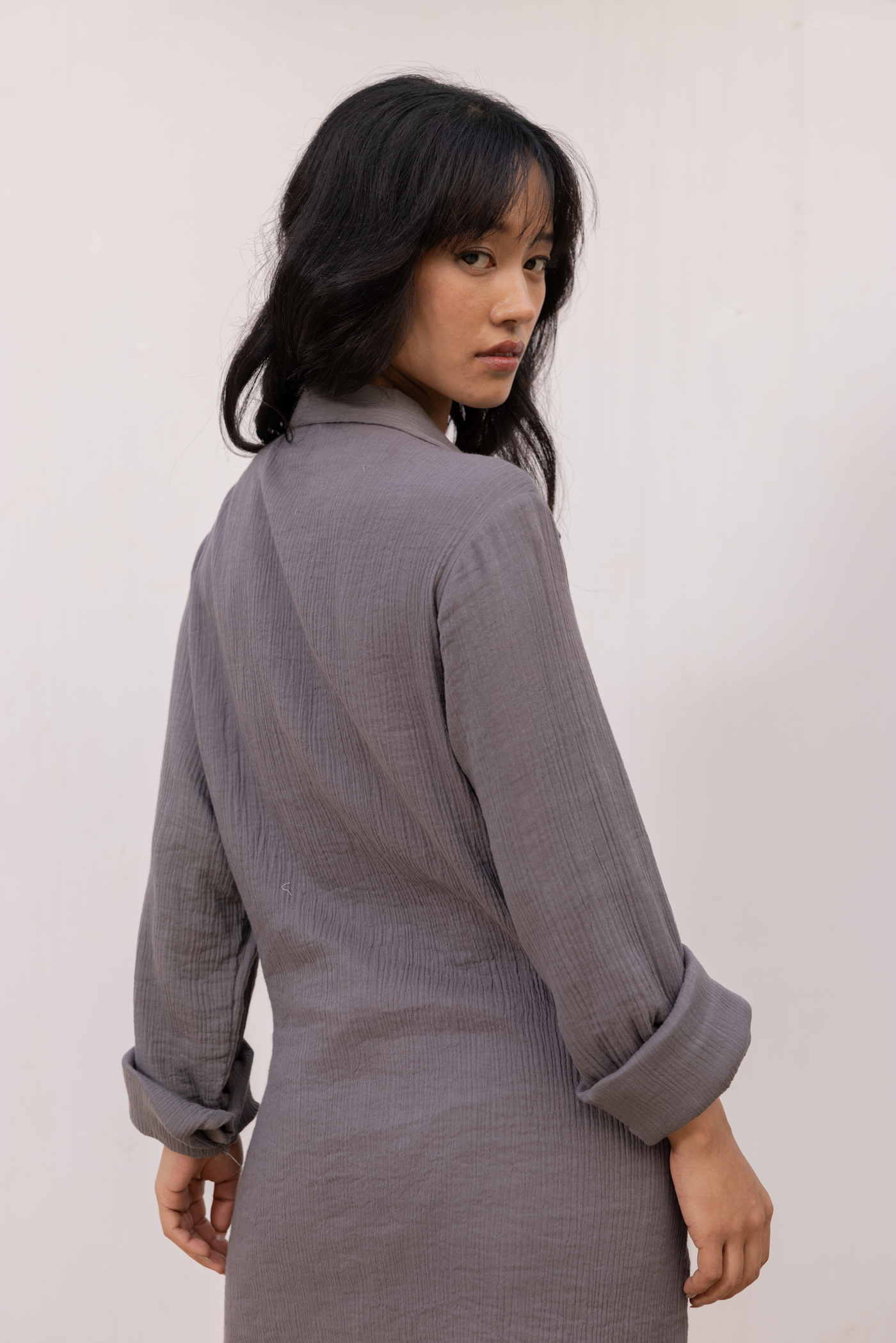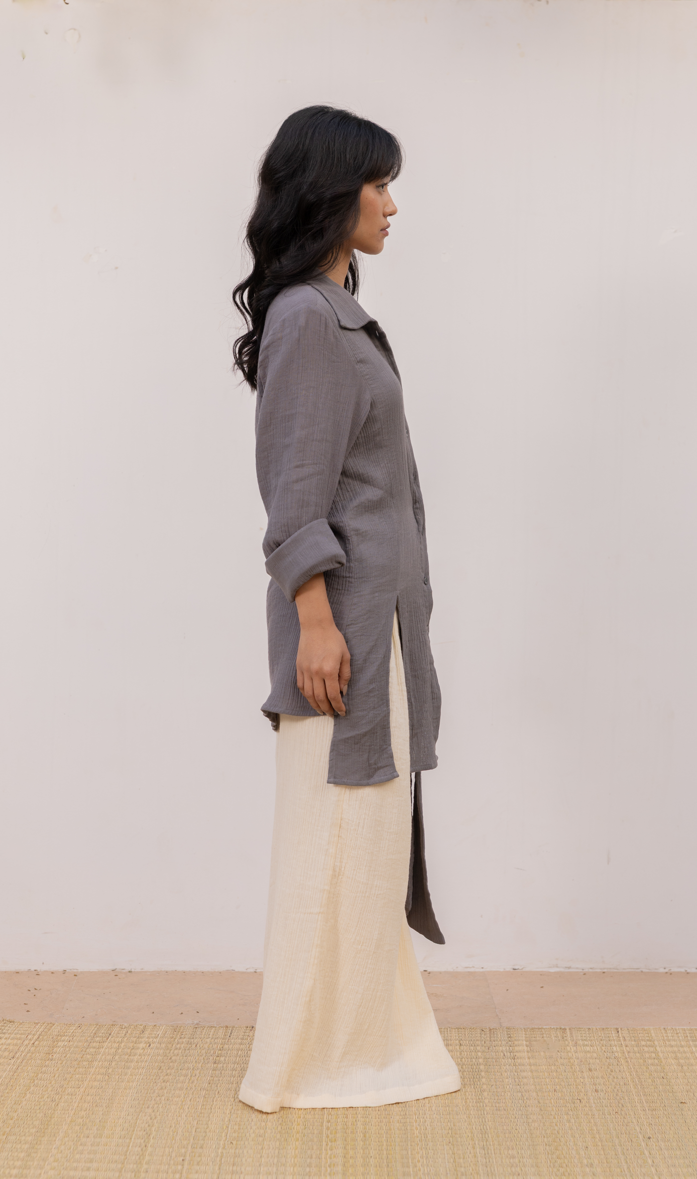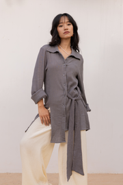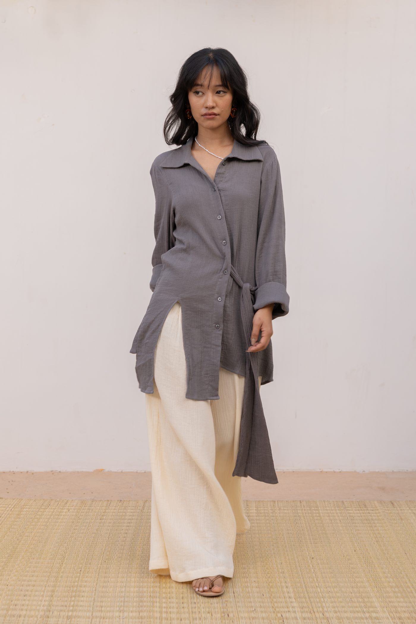 Constructed in lightweight crushed cotton with a button-down front and a waist tie detail.